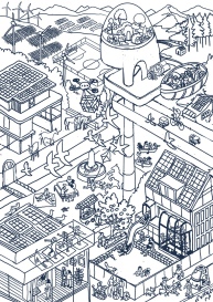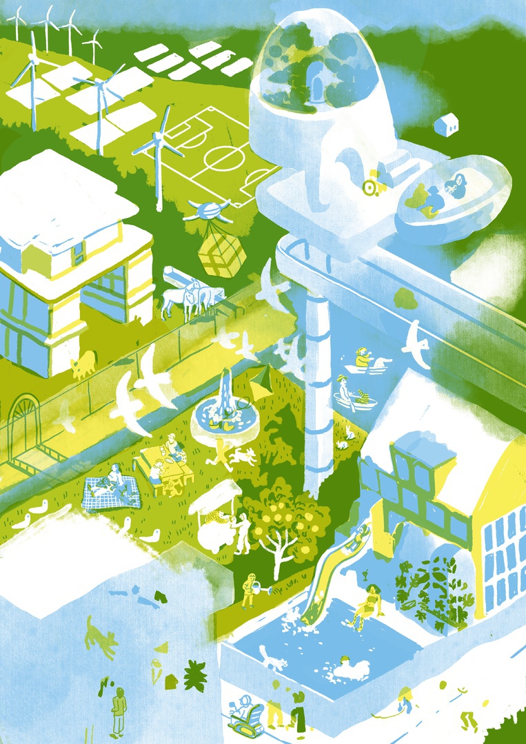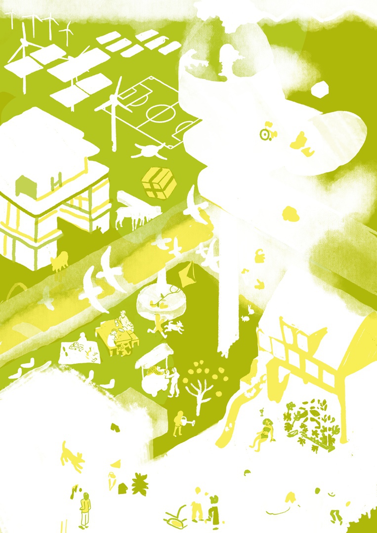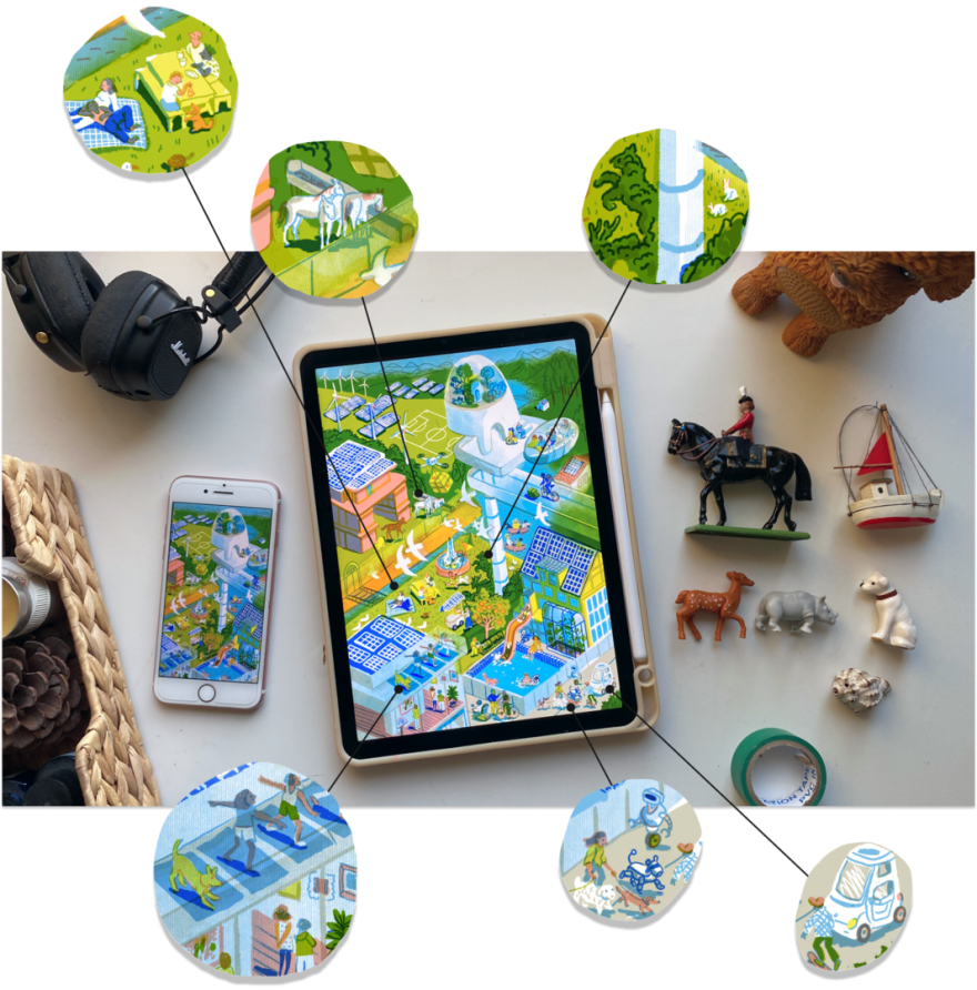 I created this illustration using a limited — yet vibrant — palette, assigning one color per layer with multiply blending mode, in the style of digital lithography. This technique evokes a