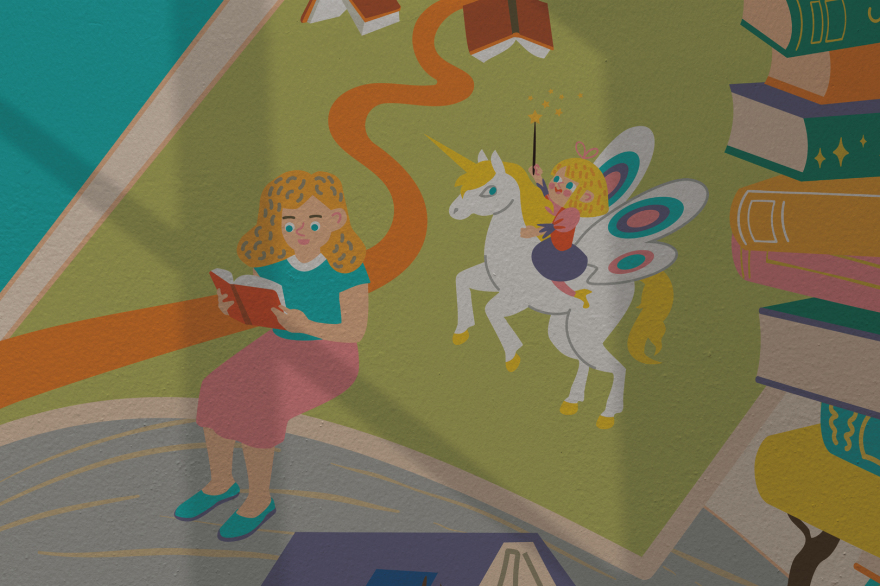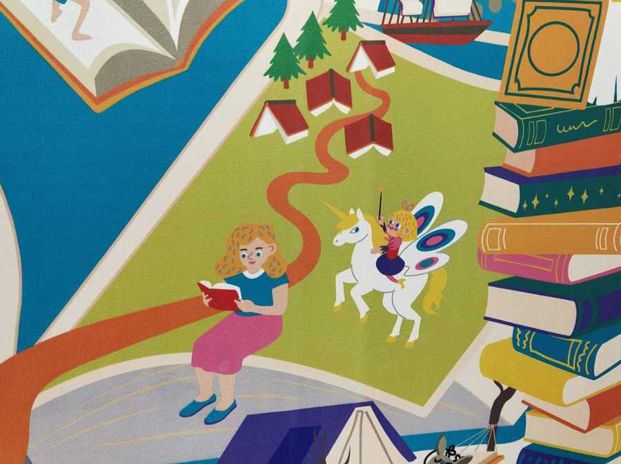 A rich, whimsical scene transporting the characters into the magical world of books. The most complex of all five, designed to show that literature is anything but boring.