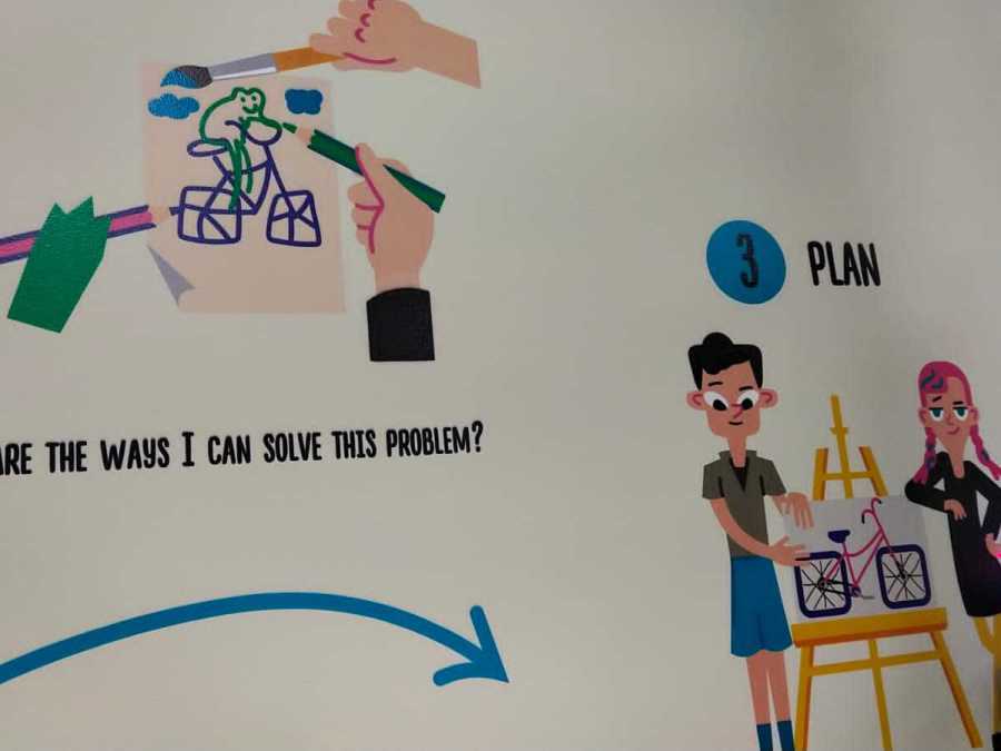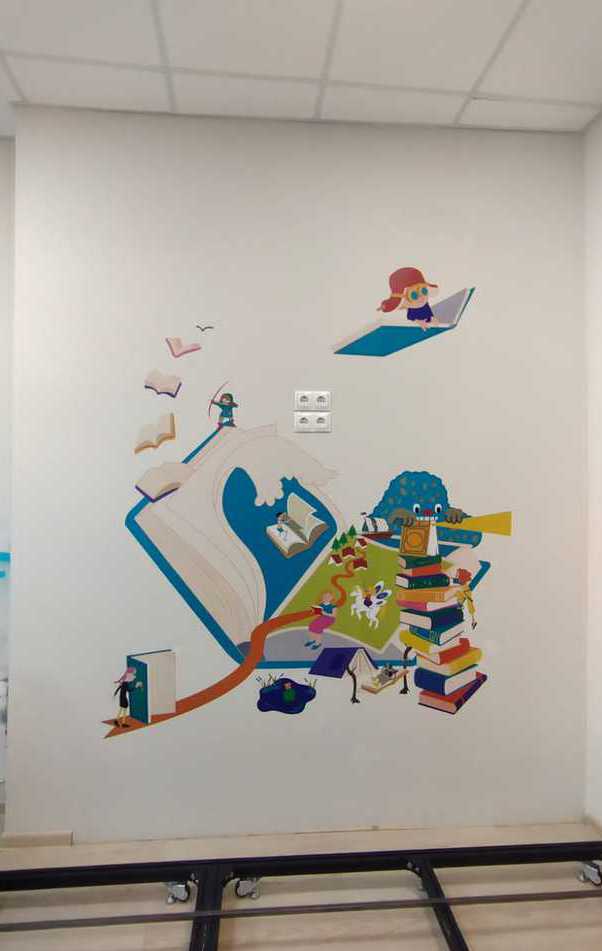 I had just two months to develop a cast of original characters and create full-scale scenes tailored to five themed classrooms: Sports, Informatics, Art, Literature,