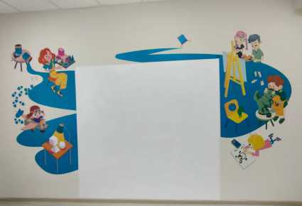 This mural was designed around a fixed whiteboard area. The scene shows students mid-creation — with a little mystery too (who spilled the paint?)