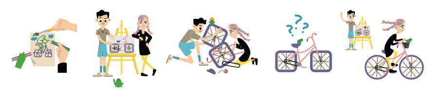 The same bike appears later in the Art Class drawing and in action in the Sports scene.