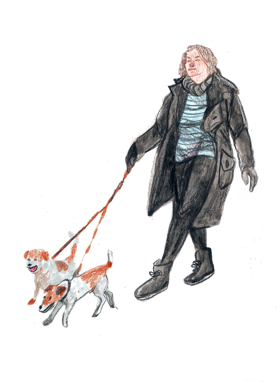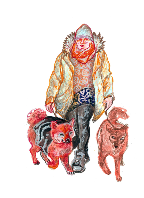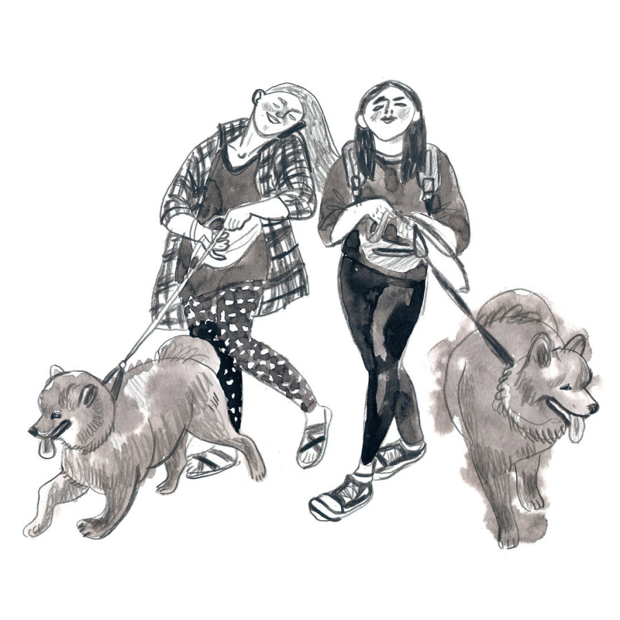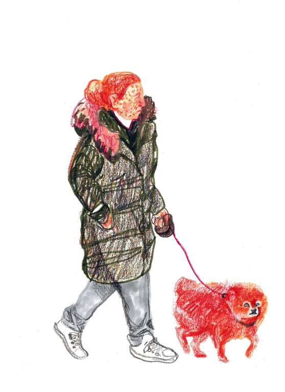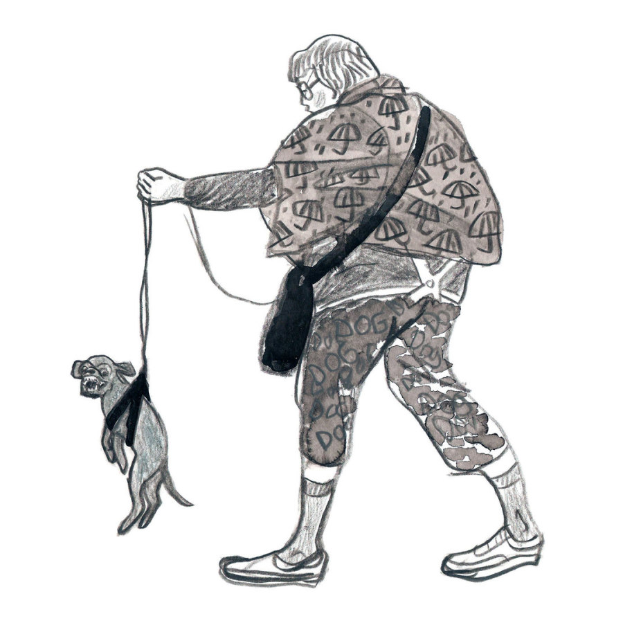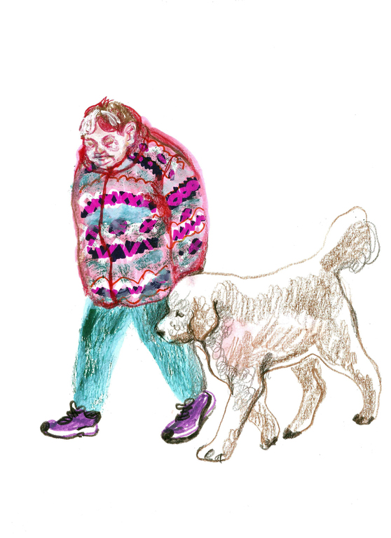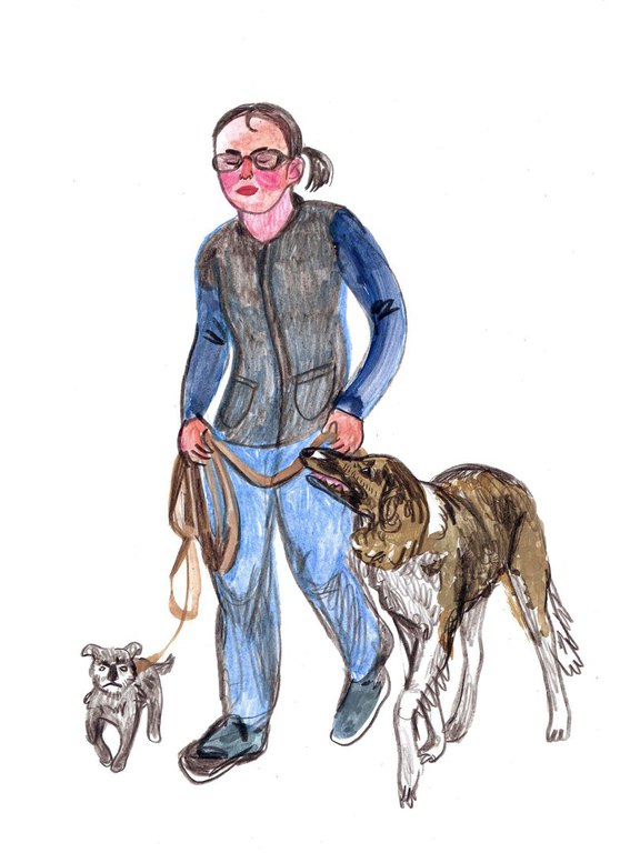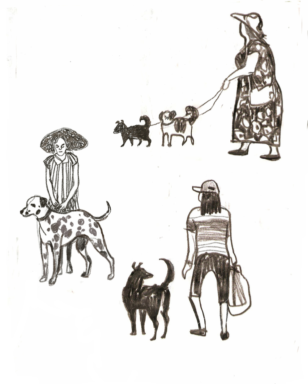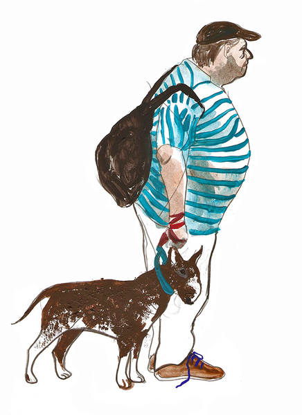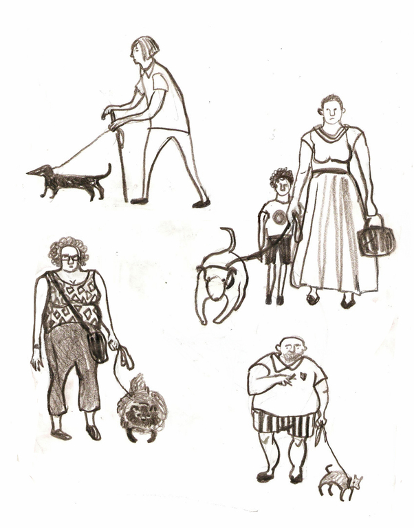 When I want to experiment with new techniques and materials I go back to DOG PEOPLE and try new approaches on old sketches. I find this theme ever-inspiring for the endless variety of different shapes and sizes of the dogs and their owners.